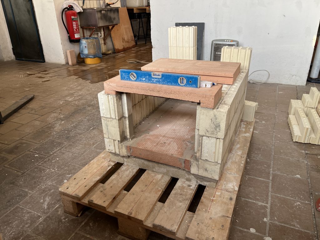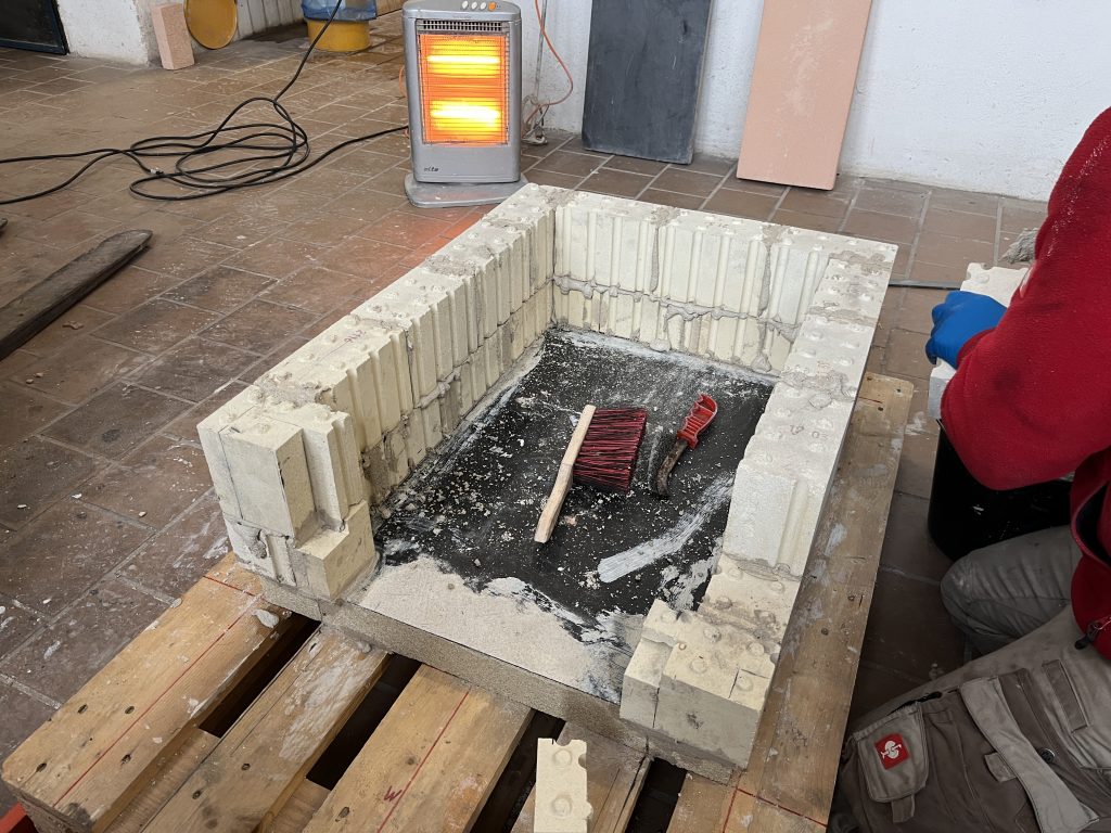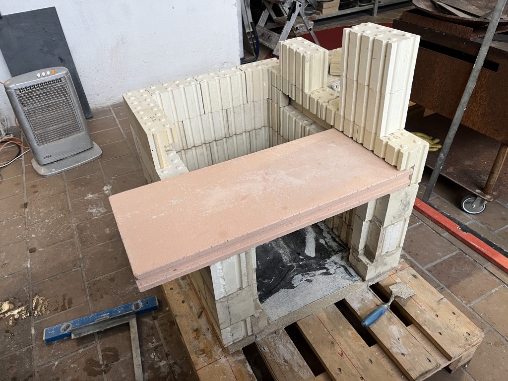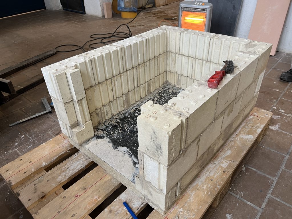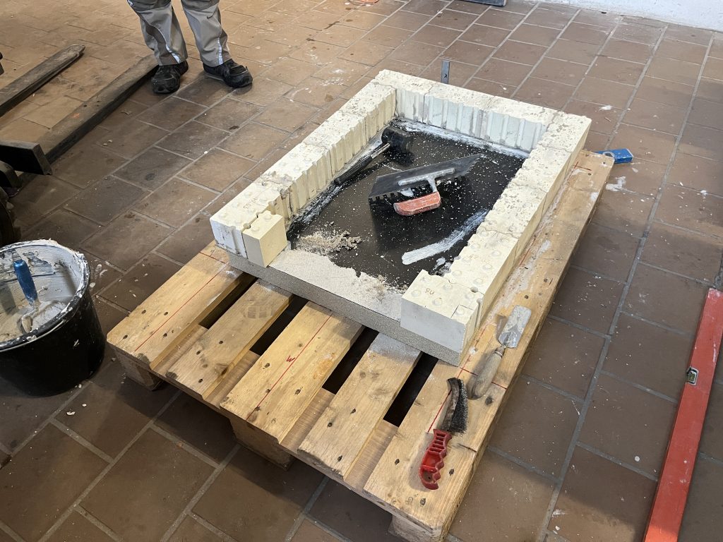 Nach Sichtung und Zusammenstellung des Materials (hauptsächlich Schamotte in unterschiedlichen Formaten) hat unser Azubi die Größe und die Bauweise festgelegt.